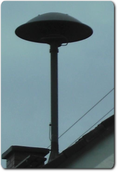 durch eine Motorsirene Typ E57, die am Dach eines Gebäudes in der Dorfmitte